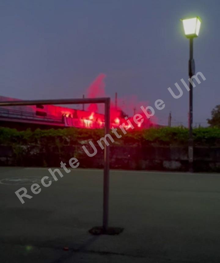 Am Sonntagabend dem 05.06.22, posierten vier vermummte Personen mit zwei Bannern vor der Ulmer Synagoge, auf einem war eine schwarze Sonne zu sehen. Augenzeug:innen beobachteten das Geschehen und intervenierten. Der 05.06. ist der Jahrestag des Brandanschlags von 2021 auf die Synagoge.