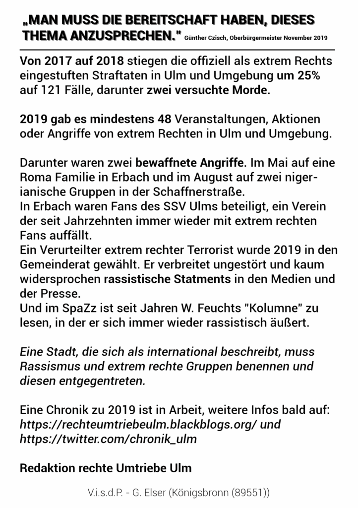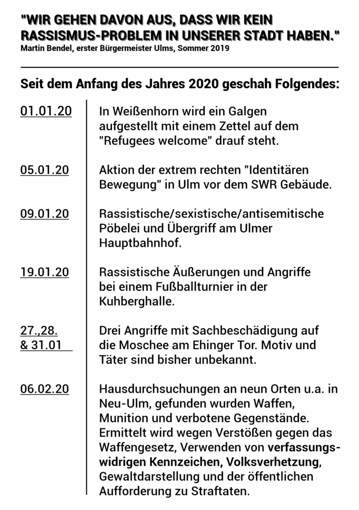 „Wir gehen davon aus, dass wir kein Rassismus-Problem in unserer Stadt haben.“ – diese Aussage traf Martin Bendel, erster Bürgermeister Ulms, im Sommer 2019 nach dem rassistischen Angriff auf zwei Gruppen im Bürgerhaus Mitte Ulm.
