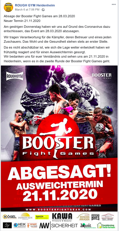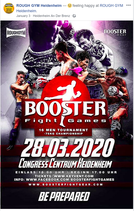 Stephan Planincs nächster Kampf ist bereits angekündigt, er soll – mal wieder – im Congress Centrum Heidenheim bei den Booster Fightgames in den Ring steigen. Ursprünglich für den 28.03.20 angekündigt, wurde die Veranstaltung nun in den November verschoben.