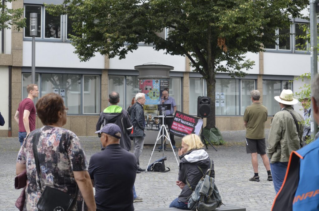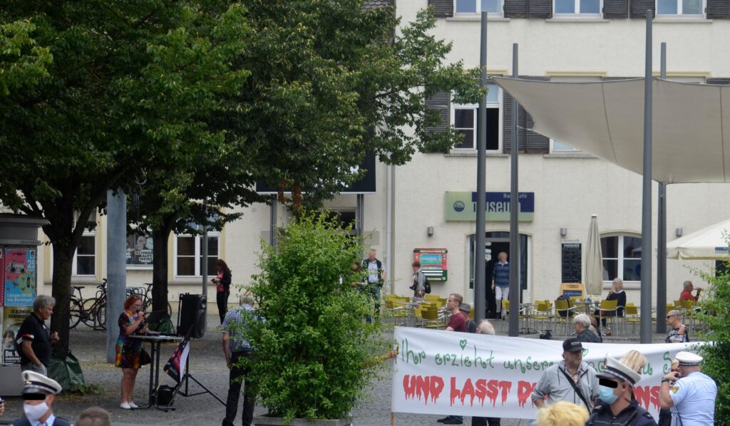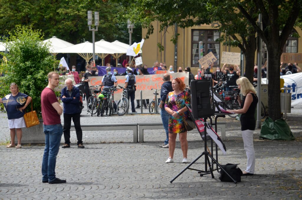Aus diesen und anderen Videos hervor geht auch die lautstarke Gegendemonstration, die sich unter anderem nach einer angemeldeteten Kundgebung am Hans und Sophie Scholl Platz zum Marktplatz und der AfD Kundgebung bewegte. Daran nahmen mehr als doppelt so viele Personen teil. Die Angaben linker Gruppen schwanken zwischen 60 und 100 Personen.