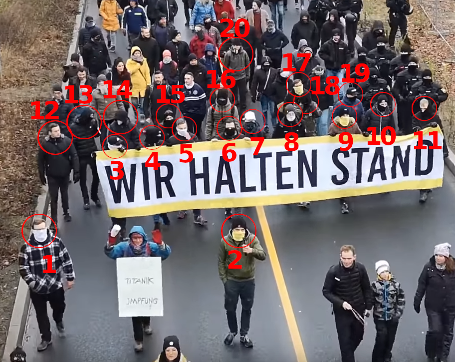 In Nürnberg nahmen mindestens 23 Personen an der Bildung eines Demonstrationsblocks auf einer Querdenken Demonstration teil, eine genaue Auflistung welche Personen wo waren findet sich hier
