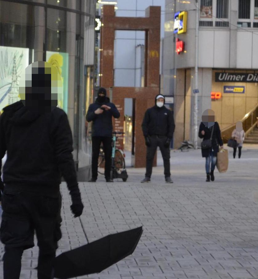 Eine der beiden störenden Personen ist Nicolas Brickenstein, ein jahrelanges Mitglied der Identitären Bewegung Schwaben, welcher bereits am 30.11.2021 eine linke Kundgebung zur humanitären Krise an der polnischen Grenze störte. Er war mit einem schwarzen Schlauchschal vermummt, trug eine Jacke und Mütze der Marke Lyle and Scott, die unter Aktivist:innen der Identitären Bewegung beliebt ist, und filmte mit einem Handy.